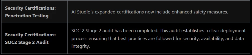 With the release of v1.55.13, HP AI Studio has completed the SOC2 State 2 audit on the path to SOC2 certification. In addition, Penetration Testing compliance elements have released in this version of the software to enhance solution security.
